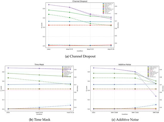 Robustness analysis of STG-CLNet and baseline models under different perturbation conditions simulating noisy ATC multitasking and distraction scenarios. (a) Random channel dropout at varying levels, (b) temporal masking with different masking ratios, and (c) additive Gaussian noise at different signal-to-noise ratios (SNRs). Both F1-score (solid lines) and Accuracy (dashed lines) are shown. All legend entries correspond to plotted lines, though some overlap due to similar values.