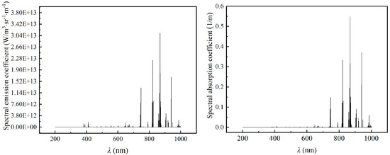 where is the spectral radiative intensity at wavelength , is the emission coefficient representing the radiative power emitted by the medium per unit wavelength, and is the absorption coefficient representing the medium’s ability to absorb radiation per unit length. By examining Equation (18), it can be seen that radiative energy transfer is a process in which energy emitted at a specific wavelength is gradually attenuated by the medium as it propagates. The emission and absorption coefficients are the key parameters controlling this process.