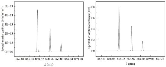 In addition, using the LBL radiation module integrated into the custom-designed DSMC framework, the bound–bound triplet transitions of atomic nitrogen near the wavelength of 868 nm were calculated. The corresponding emission and absorption coefficients are presented in Figure 2. The results demonstrate excellent agreement with the expected spectral characteristics of the triplet bound states of atomic nitrogen, successfully capturing their radiative behavior.