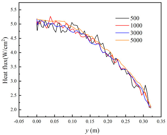 When the number of photons per cell is low (e.g., <1000), the heat flux curve exhibits noticeable numerical fluctuations, indicating large statistical sampling errors. As the number of photons increases, particularly beyond 3000 per cell, these local fluctuations are substantially suppressed. At 5000 photons per cell, the heat flux distribution becomes smooth and statistically converged, providing reliable results for both radiative transfer modeling and engineering evaluation.