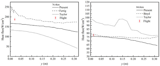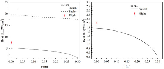 Figure 6 shows the radiative wall heat flux distributions at the two re-entry times, 1631 s and 1634 s. Although some error remains in the predicted results at 1634 s, the present calculation shows closer agreement with experimental measurements compared to Taylor’s results. In contrast, Fertig’s predictions overestimate the radiative heat flux, exceeding 100 W/cm2, which raises questions about their accuracy.
