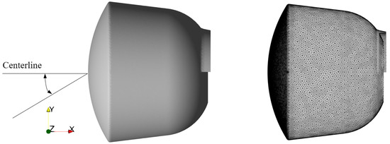 According to public reports and the literature [33], the aerodynamic configuration and surface mesh of the lunar-return high-speed re-entry vehicle are shown in Figure 7. During its first re-entry, the capsule reached a velocity exceeding . In this study, two representative altitudes, and , are selected to investigate the radiative characteristics during the re-entry process.