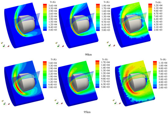 Figure 8 presents the contour plots of translational, rotational, and electronic temperature distributions at altitudes of 90 km and 95 km. A comparison of the translational temperatures at both altitudes reveals that although the peak values remain unchanged, the area of the high-temperature region increases significantly at higher altitude. This phenomenon can be attributed to the fact that collision frequency is positively correlated with particle number density. As the density decreases, collisions occur less frequently, requiring more time for kinetic energy to be converted into thermal energy.
