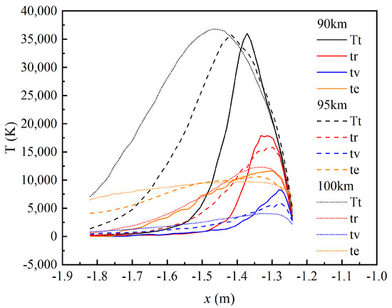 Figure 9 presents the temperature distribution along the central axis of the flow field surrounding the re-entry capsule. Combined with the temperature contour maps in Figure 8, it can be observed that the temperature profiles at 90 km and 95 km exhibit consistent trends. The translational temperature shows minimal variation with altitude, whereas the rotational, vibrational, and electronic temperatures undergo more significant changes. As the altitude increases, the particle collision frequency decreases, leading to slower energy exchange among internal modes and resulting in increasingly pronounced thermal non-equilibrium effects.