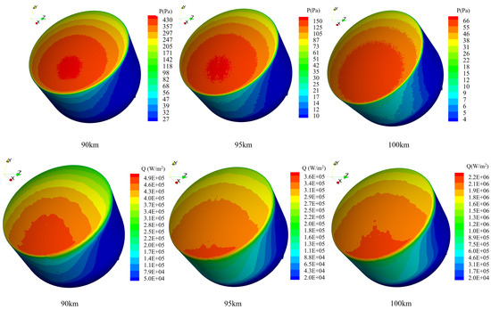 Further analysis of the heat flux and pressure distribution along the capsule surface is presented in Figure 10, which shows the wall pressure and heat flux contours for the lunar-return-type re-entry capsule. Under the same conditions of particle mass, incident velocity, and boundary constraints, the surface pressure is primarily determined by the frequency of particle impacts on the wall. As the altitude increases and the gas becomes more rarefied, the number of particles striking the surface per unit time decreases, leading to a reduction in wall pressure. In addition, the layered structure of surface pressure along the capsule’s rotational face becomes increasingly diffuse with altitude.