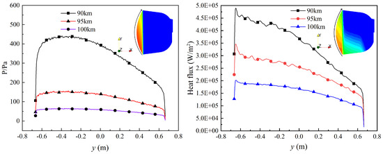 The wall heat flux contours reveal that the heat load on the aft base of the capsule decreases with increasing altitude, accompanied by a gradual loss of stratification in the heat flux distribution. Due to the presence of an angle of attack, the heat flux and pressure distributions on the capsule’s aft base exhibit noticeable asymmetry. As shown in Figure 11, which presents the heat flux and pressure profiles along the surface, peak values for both parameters occur below the capsule centerline on the windward side, within the region . This is attributed to the direct exposure of this area to the primary free-stream, where dynamic pressure is concentrated.