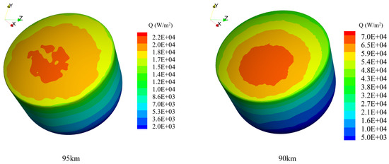 Figure 12 illustrates the surface radiative heat flux distributions for the first lunar-return re-entry of the capsule at altitudes of 95 km and 90 km. Compared with the aerodynamic heat flux distribution shown in Figure 10—where the peak aerodynamic heating is mainly concentrated near the aft shoulder due to the effect of the angle of attack—the peak of radiative heat flux is primarily influenced by the distribution of excited particles and the emission/absorption paths. As a result, the maximum radiative heating still appears on the aft base of the capsule, skewed in the direction of the angle of attack.
