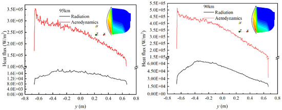 The comparison of radiative and aerodynamic heat fluxes along the centerline of the windward surface further supports this observation. In the region of , the peak of the radiative heat flux aligns with the region shown in Figure 13, exhibiting a clear offset trend corresponding to the angle of attack.