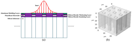 The CCD consists of an array of Metal-Oxide-Semiconductor (MOS) capacitors arranged in rows for photoelectric conversion and charge storage [22]. A microlens layer is usually placed above the MOS unit to focus light onto the light sensor region. However, the microlens does not absorb laser energy directly, and its damage mainly affects imaging quality rather than causing functional failure of the CCD [23]. As shown in Figure 1a, the CCD array includes light sensor regions and light-shielded regions arranged in parallel. The light-shielded region structure consists of an aluminum shielding layer, a silicon dioxide thickening layer, a polysilicon electrode, a silicon dioxide insulating layer, and a silicon substrate. The aluminum shielding layer protects the polysilicon electrode from direct laser exposure. The silicon dioxide thickening layer increases the optical path of incident light, allowing more photons to reach the silicon substrate. The polysilicon electrode is connected to clock signal lines for carrier transfer control. The silicon dioxide insulating layer acts as an electrical isolation layer to prevent charge overflow during signal transmission and avoid short-circuit failures. The silicon substrate serves as the photosensitive component, converting optical signals into electrical signals.