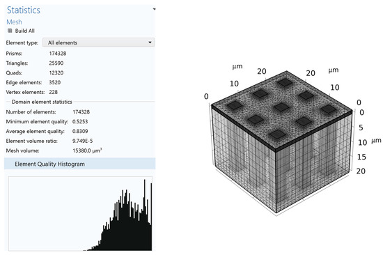 After constructing the geometric model, mesh discretization is required to partition the continuous domain into finite elements. Precise and rational meshing is critical to ensure solution convergence and accelerate convergence rates. Due to significant thermal gradients and non-uniform heating during laser irradiation, a uniform mesh distribution was inadequate. A hybrid meshing strategy was therefore implemented; a free triangular mesh with local refinement was applied at material interfaces, while swept meshing discretized bulk regions. This generated 174,328 elements collectively. The maximum element size was 2.0 μm, and the minimum element size was 0.038 μm. The final mesh configuration is illustrated in Figure 2.