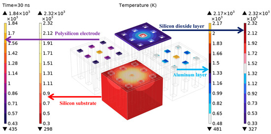 The simulation employed a Gaussian beam with a spot radius of 13 μm, a pulse width of 30 ns, and a single-pulse fluence of 1.065 J/cm2. As shown in Figure 3, upon irradiation completion (t = 30 ns), a high-temperature region formed on the silicon substrate surface, with a temperature exceeding 1685 K. Temperatures in the central area of the aluminum shielding layer rose above 2000 K but dropped below 1160 K at the edges. Among all layers, the polysilicon electrode had the lowest peak temperatures, with a maximum temperature difference of 1405 K between the central and edge regions, attributed to the thermal resistance of the silicon dioxide layer.