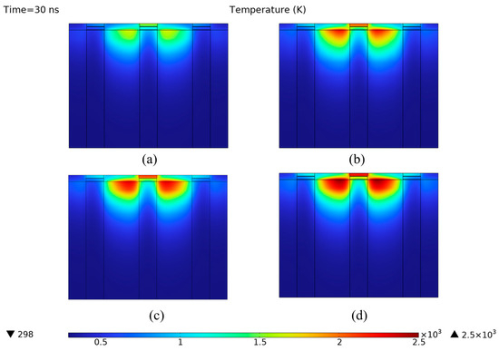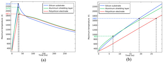 In the light sensor region, the laser heat source in the silicon substrate was defined as a volumetric heat source, creating significant localized temperature gradients. As shown in Figure 5a,b, at the irradiation termination time (t = 30 ns), the silicon material within a radius of 6.382 μm on the upper surface of the silicon substrate was molten. In the light-shielded region, the heat in the polysilicon electrode and silicon substrate was primarily due to thermal diffusion through lateral conduction from the irradiated silicon substrate and vertical conduction from the aluminum shielding layer. The surrounding silicon dioxide layer restricted heat diffusion, leading to local heat accumulation at the insulation layer interface. In the light-shielded region, heat diffusion from the light-shielded region caused the temperature at the four corners of the substrate surface and under the corresponding electrodes to exceed the melting point of silicon. Heat diffusion from the aluminum layer resulted in thermal damage in about 48% of the area on the electrode surface.