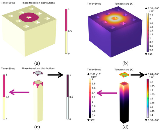 (a) Phase transition of the silicon substrate in the light sensor region. (b) Temperature field distribution of the silicon substrate in the light sensor region. (c) Phase transition of polysilicon electrode and silicon substrate in the light-shielded region. (d) Temperature field distribution of polysilicon electrode and silicon substrate in the light-shielded region (0 and 1 in the phase transition images (a,b) denote solid phase and liquid phase, respectively).