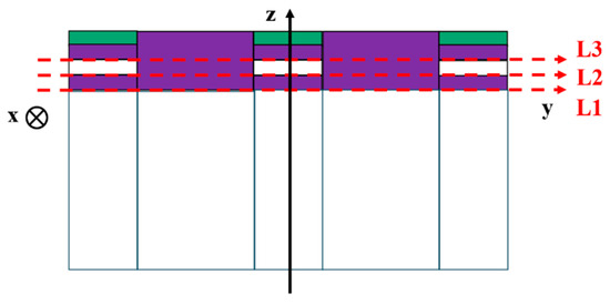 As shown in Figure 8, three special lines were set along critical interfaces of the multilayer structure to analyze the impact of laser fluence on the temperature field of the CCD. L1 was at the interface between the upper surface of the silicon substrate and the silicon dioxide layer. L2 was at the interface between the lower surface of the polysilicon electrode and the silicon dioxide layer. L3 was at the interface between the upper surface of the polysilicon electrode and the silicon dioxide layer. Temperature distributions were analyzed at four typical irradiation time points: t1 = 15 ns, t2 = 30 ns, t3 = 150 ns, and t4 = 300 ns.