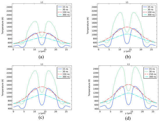 Temperature distribution of L1 (the laser fluence is (a) 0.751 J/cm2, (b) 0.987 J/cm2, (c) 1.065 J/cm2, and (d) 1.184 J/cm2, respectively).