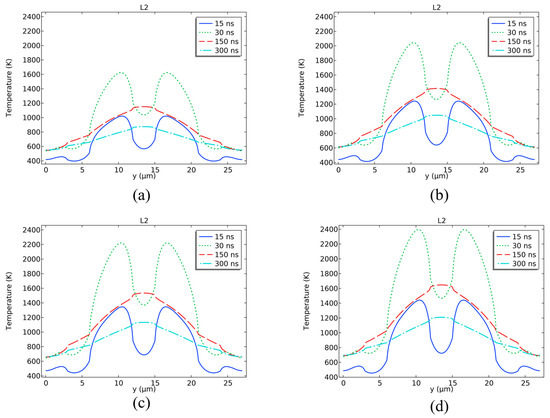 The heat received by the L2 region primarily came from thermal conduction in the photosensitive silicon substrate. As shown in Figure 10, the temperature distribution in L2 showed a wavelike pattern similar to L1 during laser exposure (t ≤ 30 ns), but due to the thermal insulation effect of the silicon dioxide layer, the temperature values in L2 were about 100 K lower than in L1. During the cooling phase (30 ns < t ≤ 300 ns), the temperature field shifted from a wavelike distribution to a single-peak pattern with higher temperatures at the center and lower values at the edges.