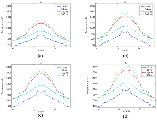 L3 was closer to the aluminum shielding layer compared to L2 and L1, resulting in higher temperatures in the polysilicon electrode beneath the aluminum during heating. As shown in Figure 11, the temperature distribution in the polysilicon electrode showed a saddle-shaped pattern during laser exposure (t ≤ 30 ns), with the edges (y = 12 μm, 15 μm) being hotter than the central region (y = 13.5 μm). This was due to lateral heat diffusion from the silicon substrate accumulating at the edges of the electrode. With increasing laser fluence, melting damage started at the edges and spread towards the center. During the cooling phase (30 ns < t ≤ 300 ns), the temperature distribution at L3 exhibits changes similar to those at L1 and L2, forming a unimodal, centrally symmetric temperature profile centered at y = 13.5 μm, with the peak temperature gradually decreasing.