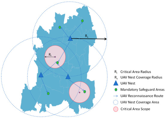 (7) indicates that there are at least two UAV nests available for reconnaissance coverage of the mandatory safeguard area center points for critical areas, and at least one UAV nest available for reconnaissance coverage of the mandatory safeguard area center points for general areas.