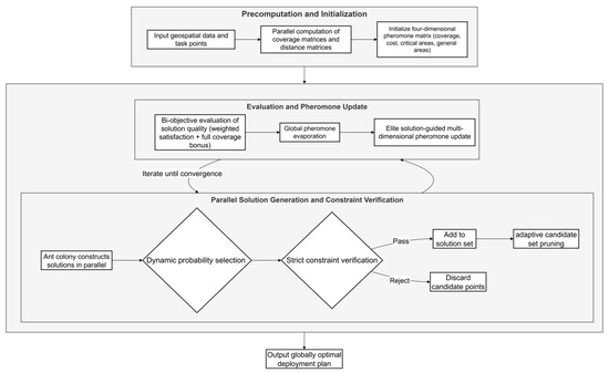 As shown in the Figure 2, the solution is structured as follows specifically. During the precomputation and initialization phase, the algorithm first inputs geospatial data and task point information, then computes two core matrices in parallel: the coverage matrix (indicating the task points and grids covered by each candidate nest) and the distance matrix (storing distances between candidate points, and between candidate points and task points). This step completes time-consuming spatial calculations in advance, laying the foundation for high-speed iteration. Subsequently, the algorithm initializes a four-dimensional pheromone matrix, providing initial guidance for the search process.