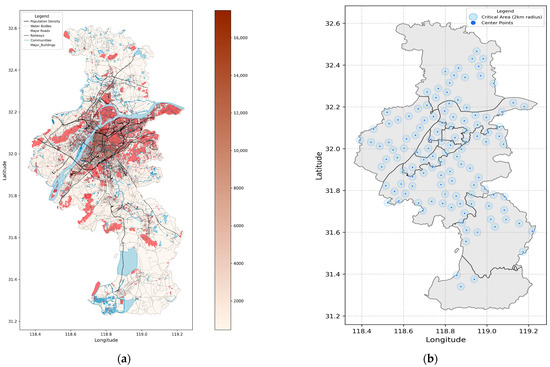Critical area center points are shown in Figure 4b with a defined radius, and the circular areas around them are highlighted on the map. This visualization illustrates the distribution of critical areas across Nanjing.