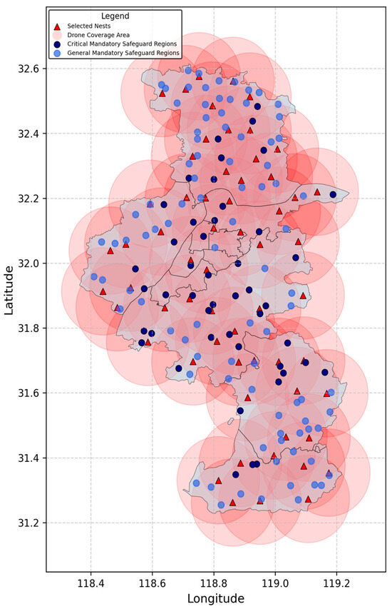 This figure presents the optimal drone nest distribution derived from the model in Nanjing, where red triangles indicate selected nest locations and translucent red circles represent their coverage areas. Critical mandatory safeguard regions are shown as solid navy circles, while general mandatory regions appear as semi-transparent royal blue circles.
