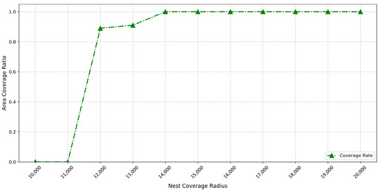 As illustrated in Figure 6, the nest coverage radius exhibits a distinct two-stage correlation characteristic with geographic coverage rate. When the coverage radius expands from 12 km to 14 km, the geographic coverage rate increases. Evidently, a larger radius enables each nest to cover more geographical units (grid points), resulting in accelerated coverage growth within this range. Beyond 14 km, the model achieves full coverage status, maintaining a stable area coverage rate at 100%. This indicates a saturation threshold that exists in the area coverage rate’s response to coverage radius—beyond this threshold, changes in the parameter no longer cause numerical fluctuations in area coverage rate.