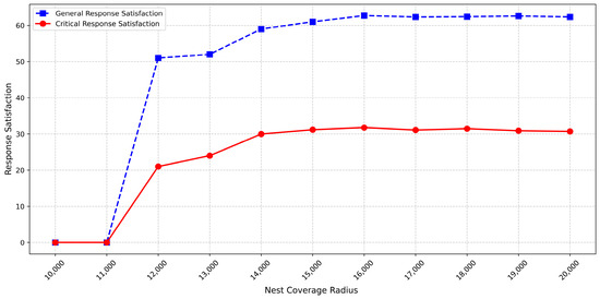 The nest coverage radius and response satisfaction also exhibit a two-stage correlation. When the radius ranges from 12 km to 16 km, response satisfactions for both area types increase with radius expansion. This is because larger radius enhance nest coverage density within the “incomplete ideal distance” of mandatory safeguard areas, increasing the number of covered centers within this interval and thereby driving satisfaction growth. Beyond 16 km, the model enters a stabilization phase: most newly covered guarantee centers under further radius expansion lie outside the “incomplete ideal distance”, contributing zero satisfaction.