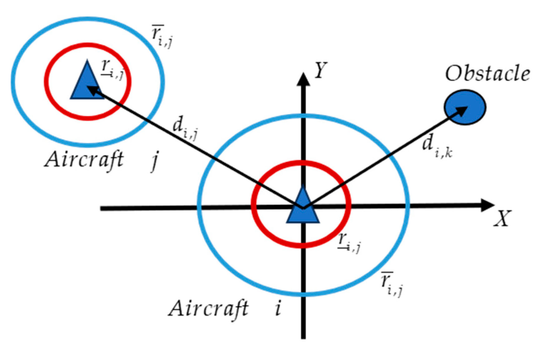 - When or , or . Here, is the minimum safe distance between aircraft , and is the minimum safe distance between the center of the -th aircraft and the center of the obstacle. is a constant, satisfying ;