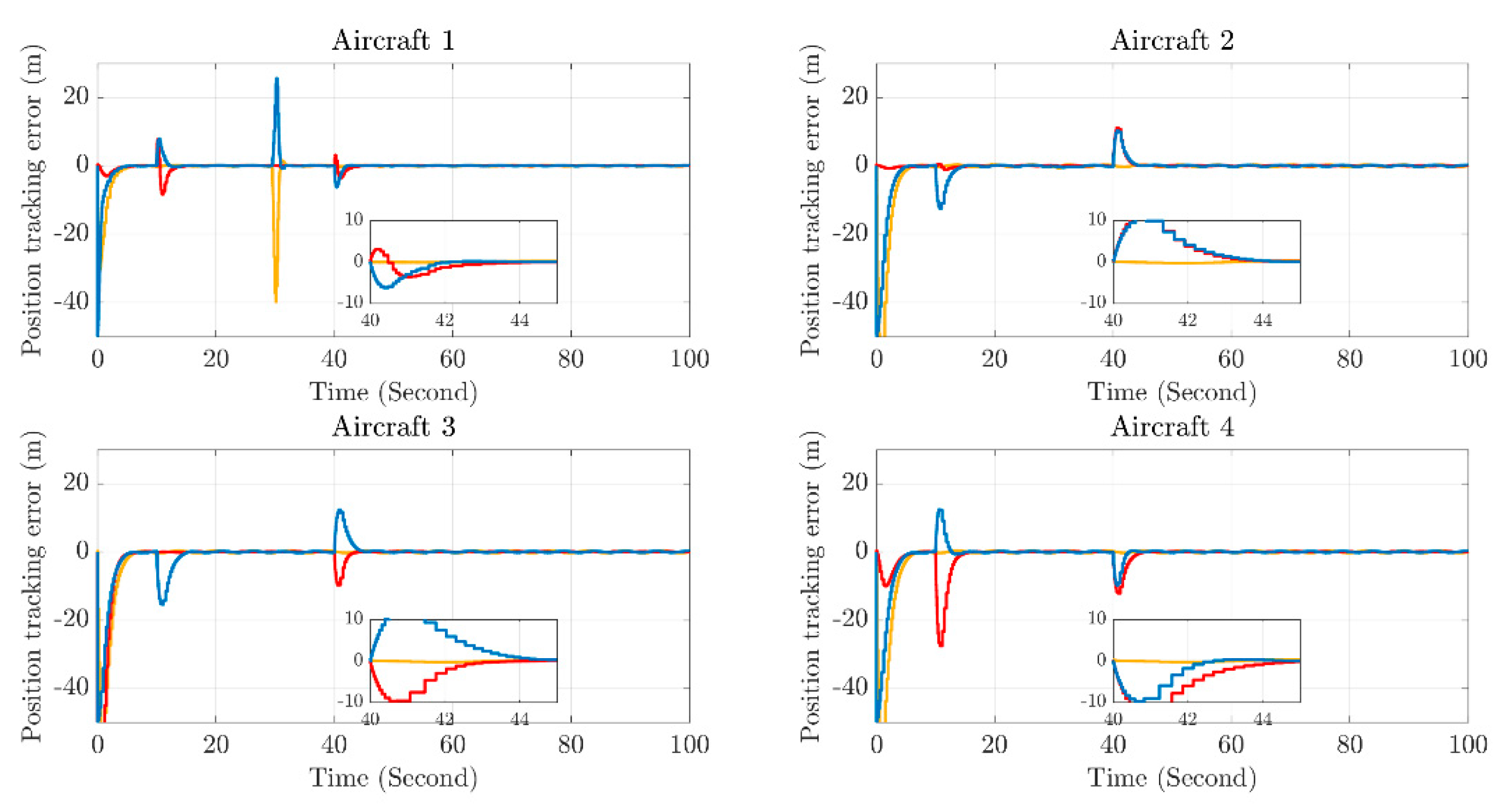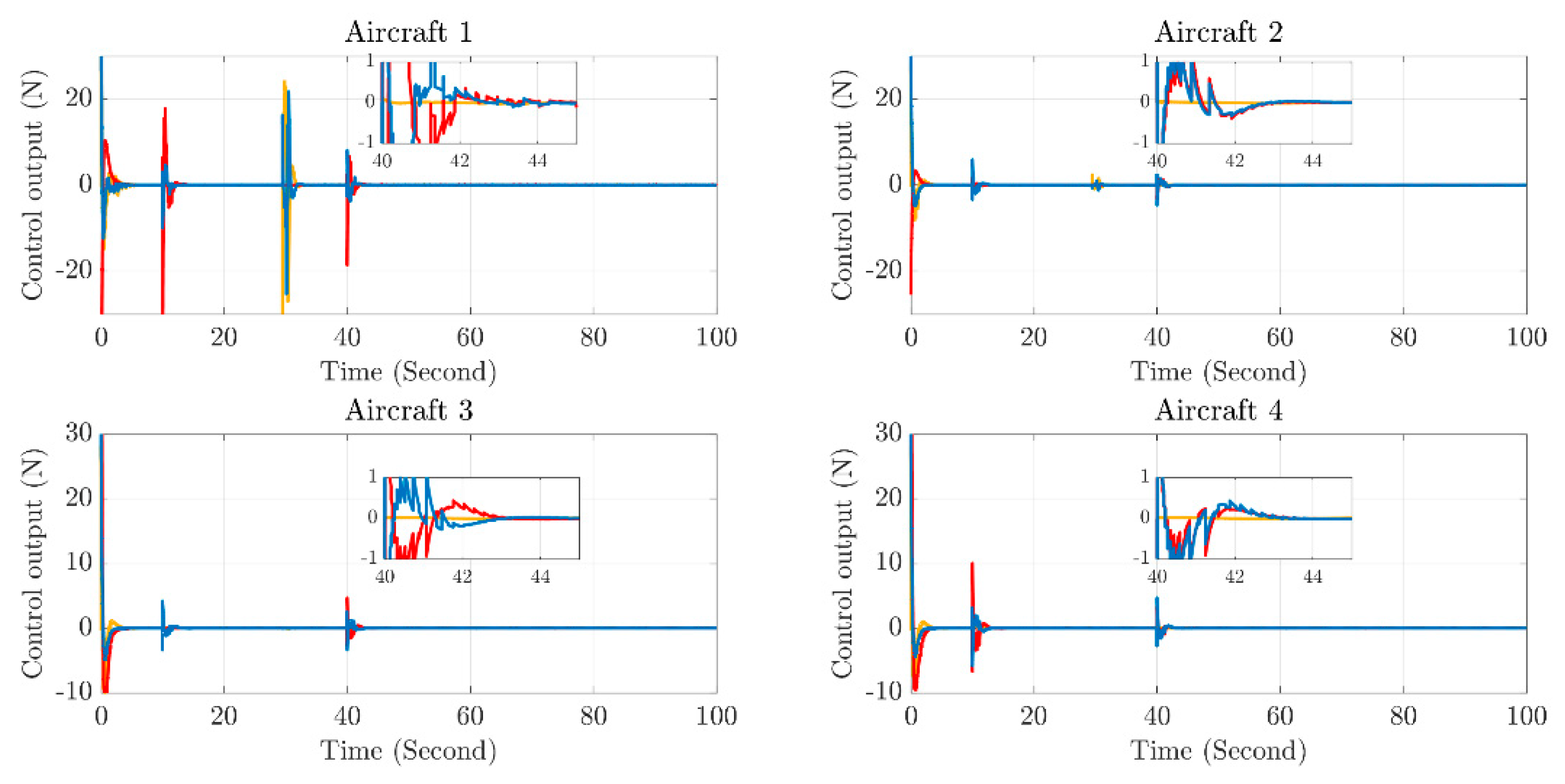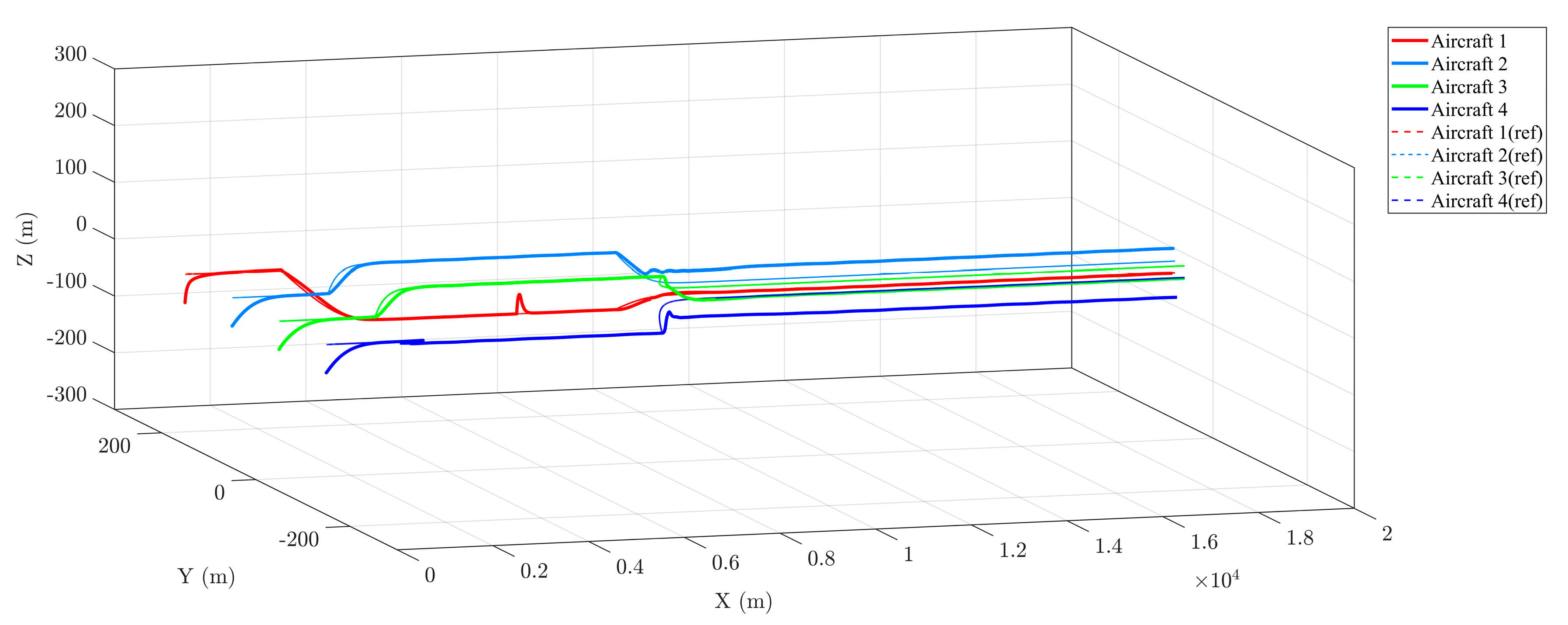 - Formation transformation stage (10–30 s): The second error convergence process corresponds to the formation transformation task of the aircraft formation. The controller adjusts the output in real-time, so that the aircraft can still converge rapidly to the new reference trajectory after the task switch, verifying the algorithm’s dynamic response capability to formation transformation commands;