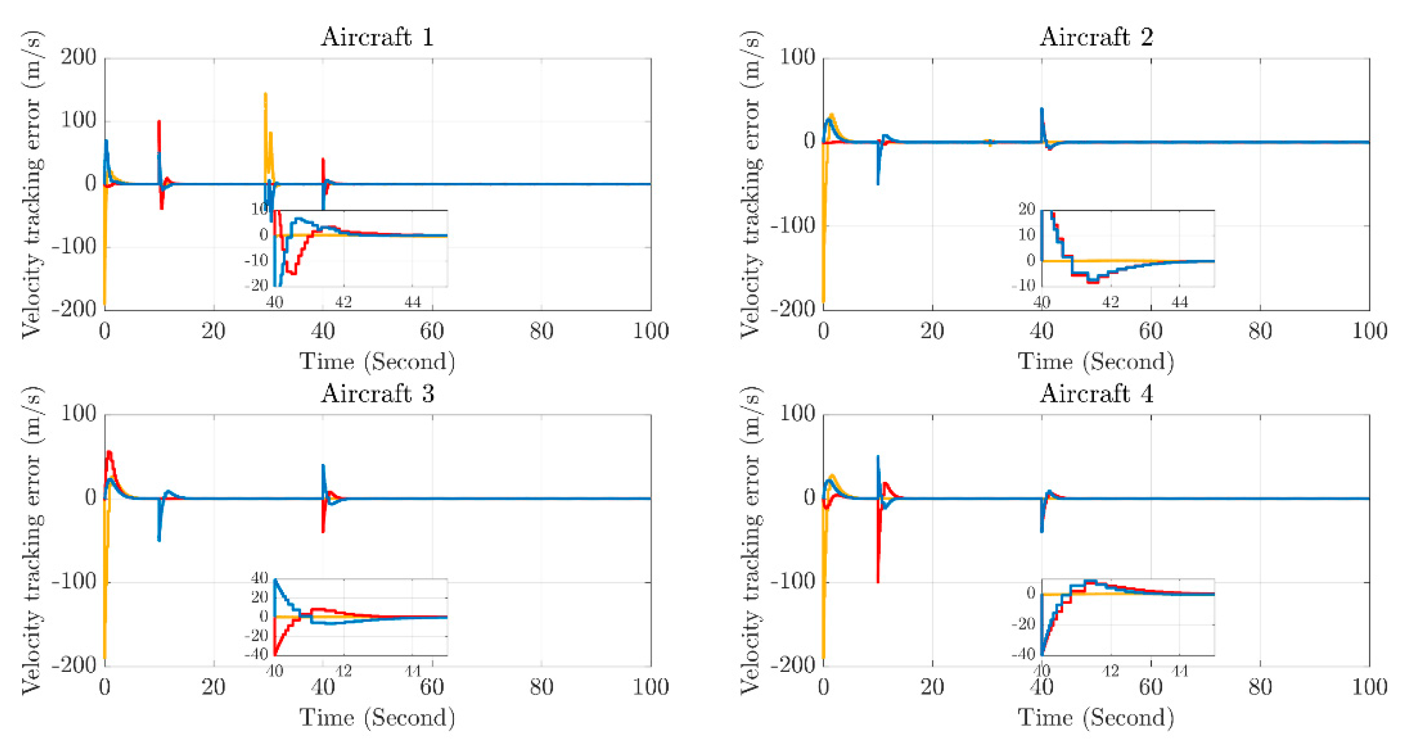- Trajectory initial tracking stage (0–10 s): The position and velocity tracking errors converge rapidly for the first time within 0–10 s. This indicates that the trajectory tracking controller under the dynamic event-triggered mechanism can drive the aircraft to rapidly approach the initial reference trajectory. The convergence speed meets the basic requirements for the timeliness of formation cooperative response, ensuring the rapid alignment of the initial configuration of the multi-aircraft formation;