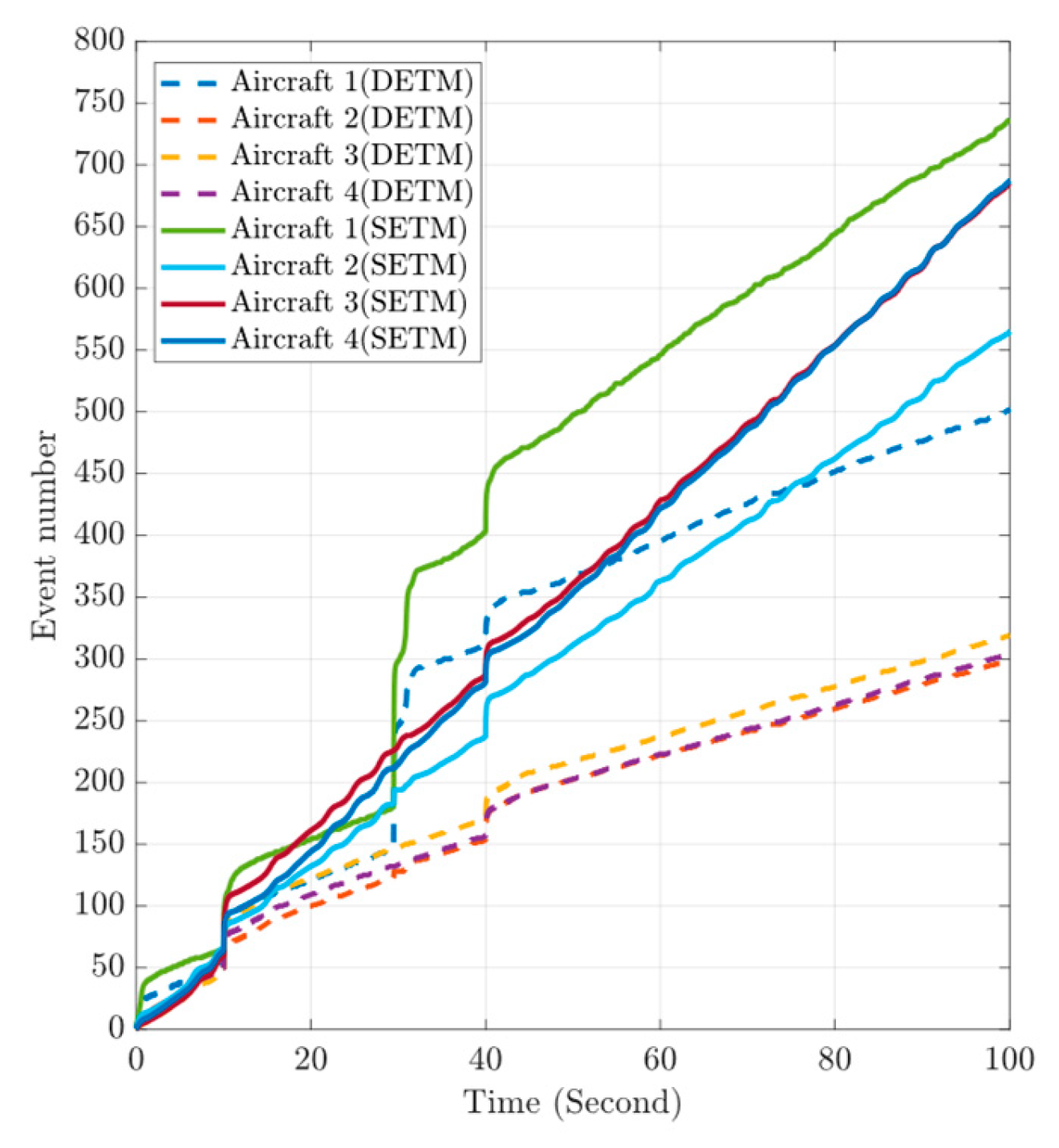 - The growth rate of the number of event triggers for each aircraft (Aircraft 1–4) under DETM is significantly lower than that under SETM. Taking Aircraft 1 as an example, within the simulation period (100 s), the number of triggers of SETM reaches 700 times, while that of DETM is only about 500 times; other aircraft (such as Aircraft 2–4) also show similar patterns, and the number of triggers of DETM is obviously smaller;