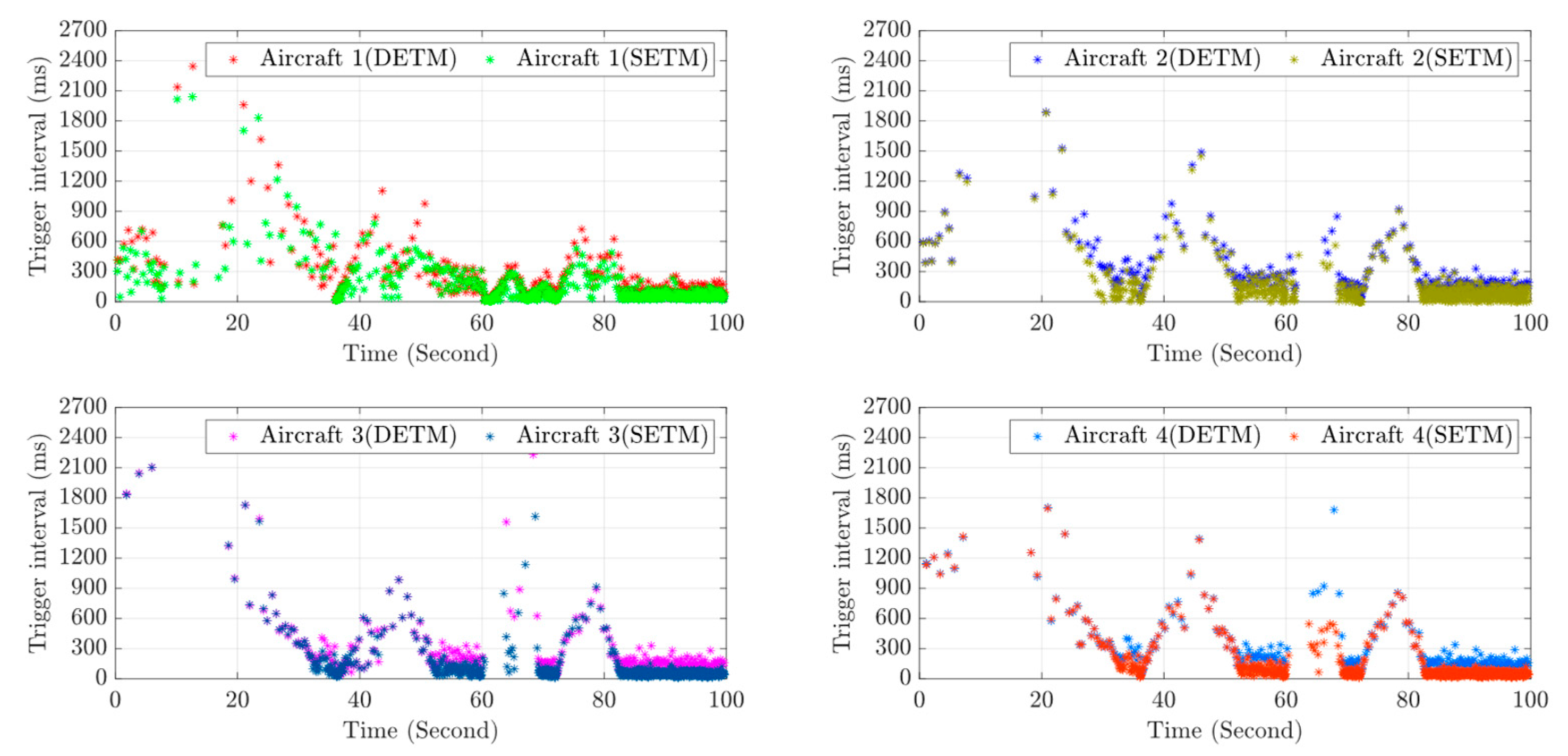 - The trigger intervals of DETM are larger than those of SETM, and the fluctuations are smoother. Taking Aircraft 1 as an example, the trigger intervals of SETM are mostly concentrated in the range of 0–600 ms, and short-interval triggers (<300 ms) occur frequently, while the trigger intervals of DETM are stably maintained at about 300 ms in the steady-state stage. Long-interval triggers (>600 ms) account for a higher proportion.