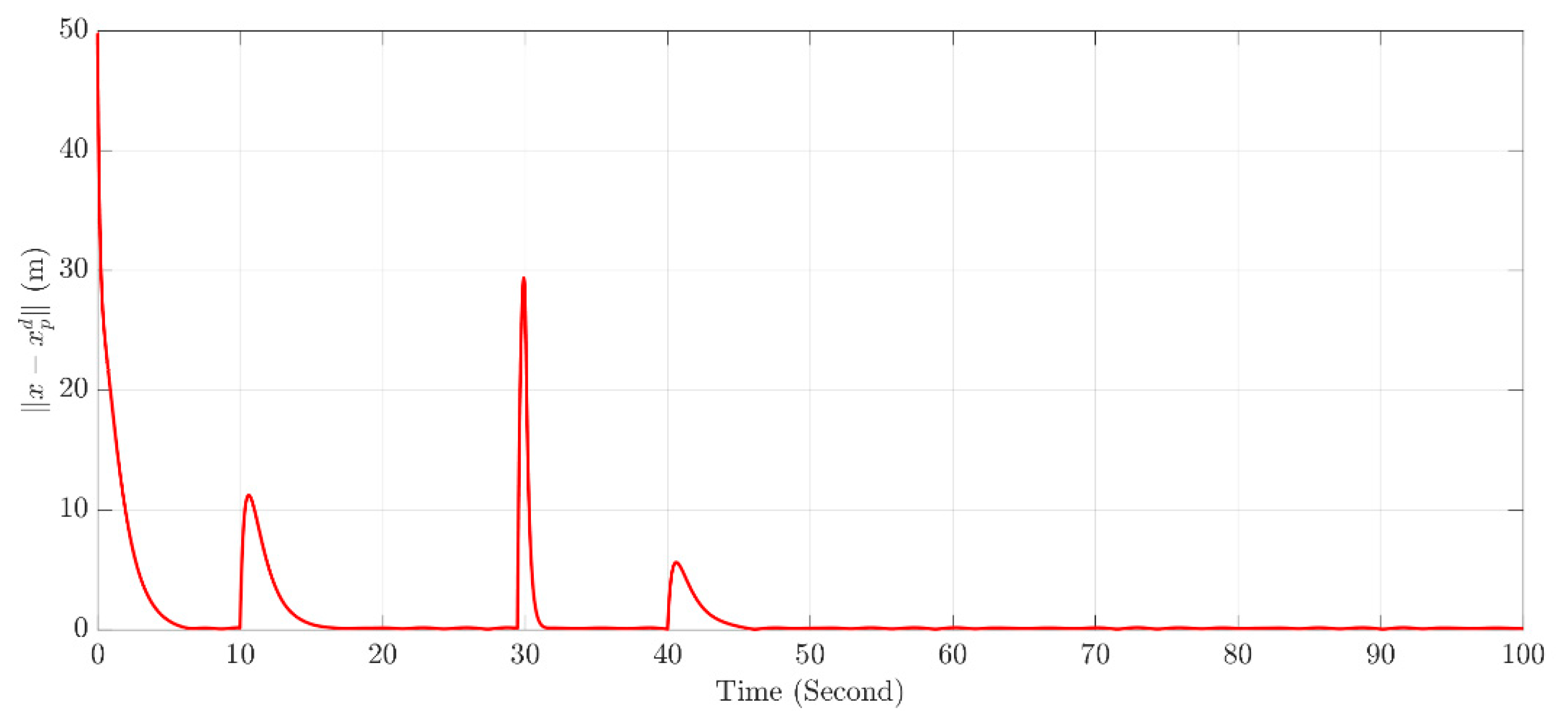 - Obstacle-avoidance coordination stage (30–40 s): The third error convergence is coupled with the obstacle-avoidance task. When the aircraft avoids virtual obstacles, the position and velocity errors converge rapidly after short-term fluctuations. Even under the influence of obstacle-avoidance path adjustments, the tracking stability can still be maintained;