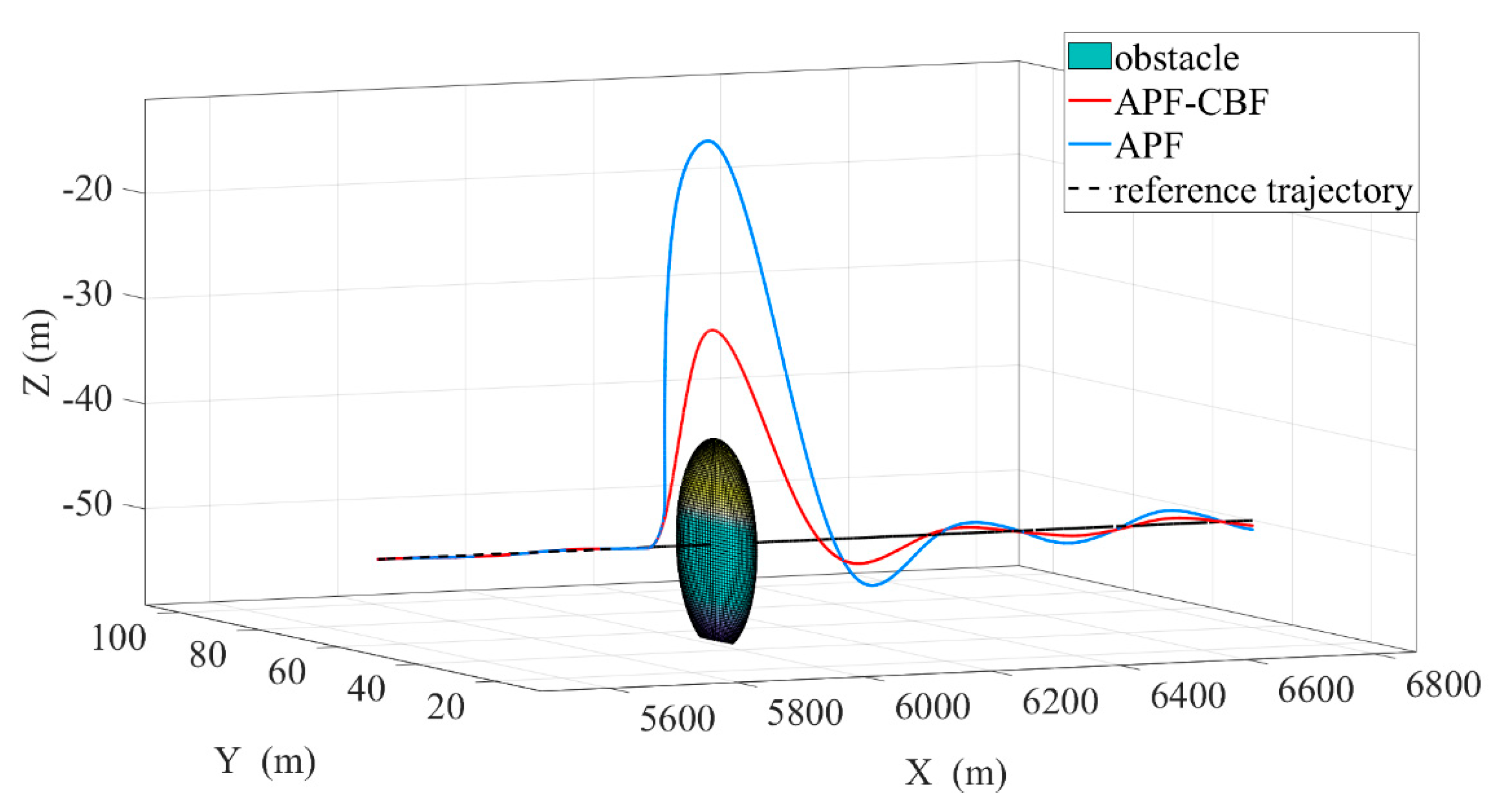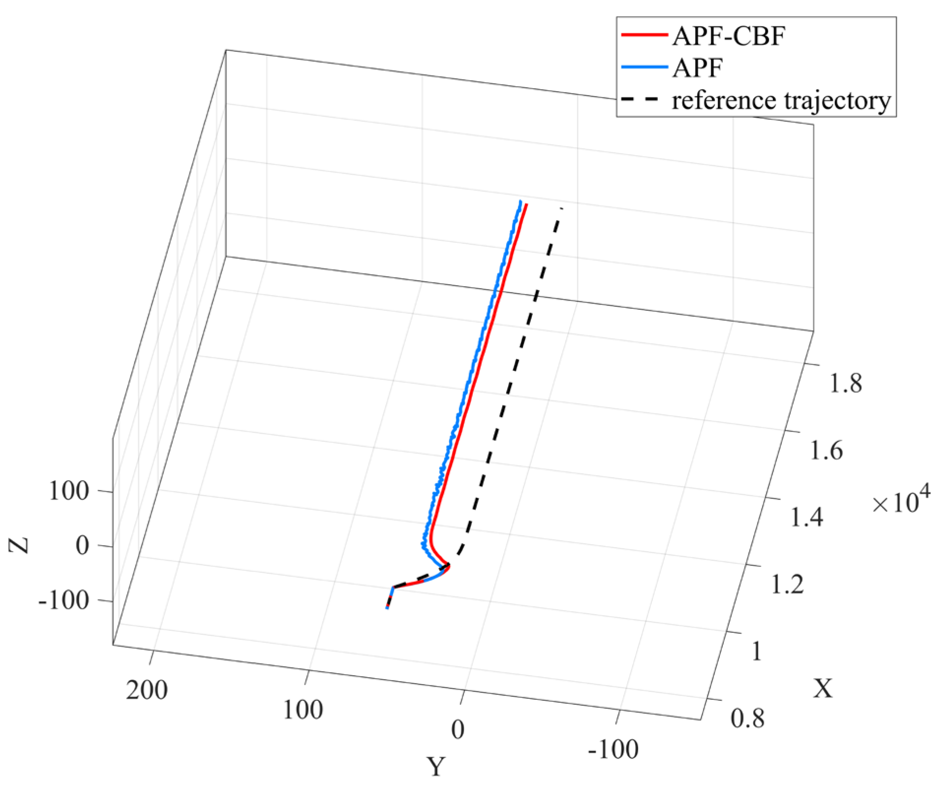 - To achieve safe collision avoidance between multiple aircraft, obstacles, and adjacent aircraft while optimizing trajectory tracking accuracy, this paper embeds the APF into the CBF framework to construct safety constraints and dynamically optimize the trajectory through a reference correction mechanism. After embedding APF into the CBF framework, safety constraint functions are constructed using the potential functions between them, and system safety is achieved by ensuring the satisfaction of the control barrier function. The reference correction mechanism adopts a quadratic programming method to minimize the deviation between the actual trajectory and the reference trajectory under the premise of satisfying safety constraints, thereby dynamically optimizing trajectory tracking accuracy;