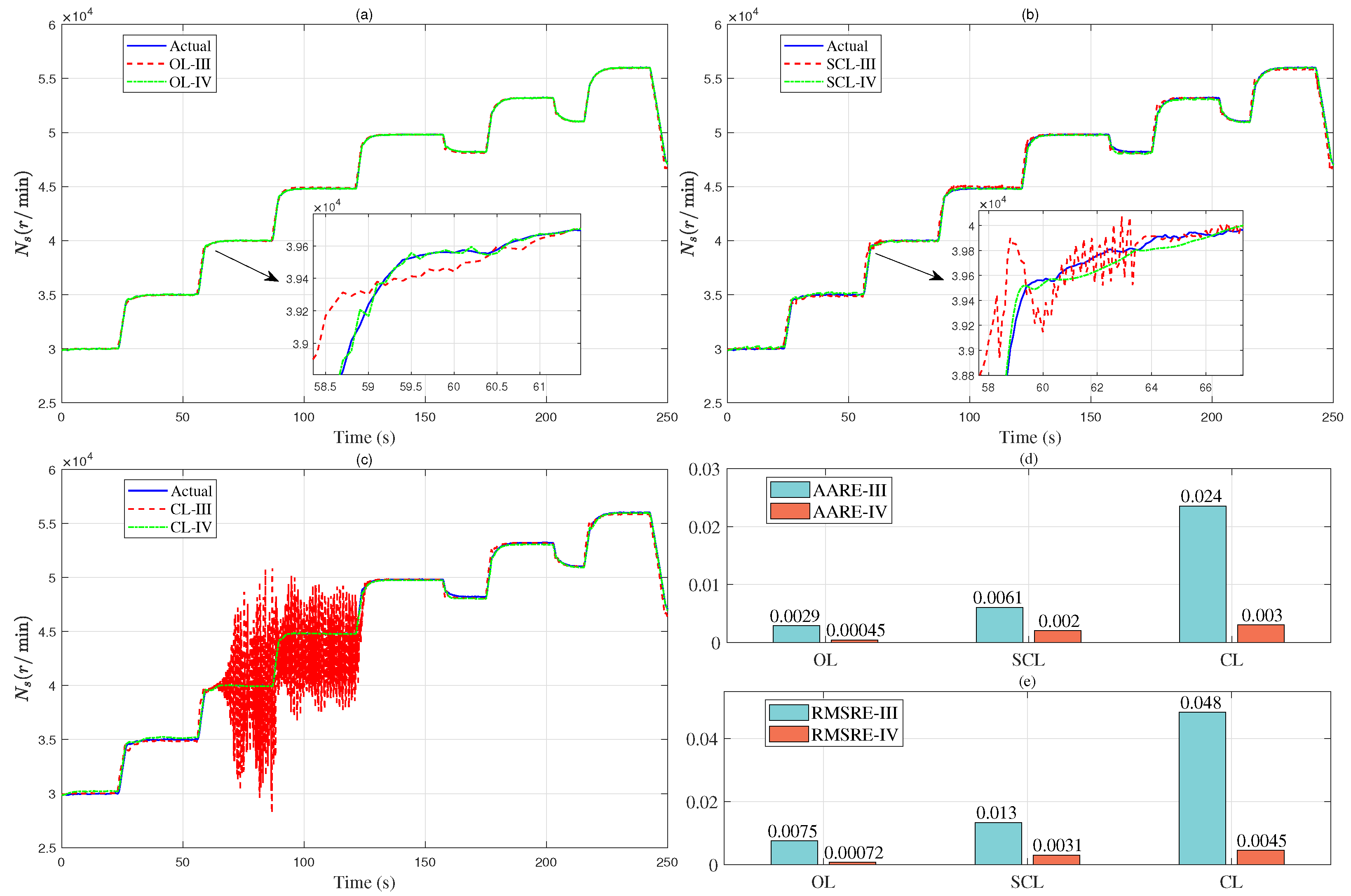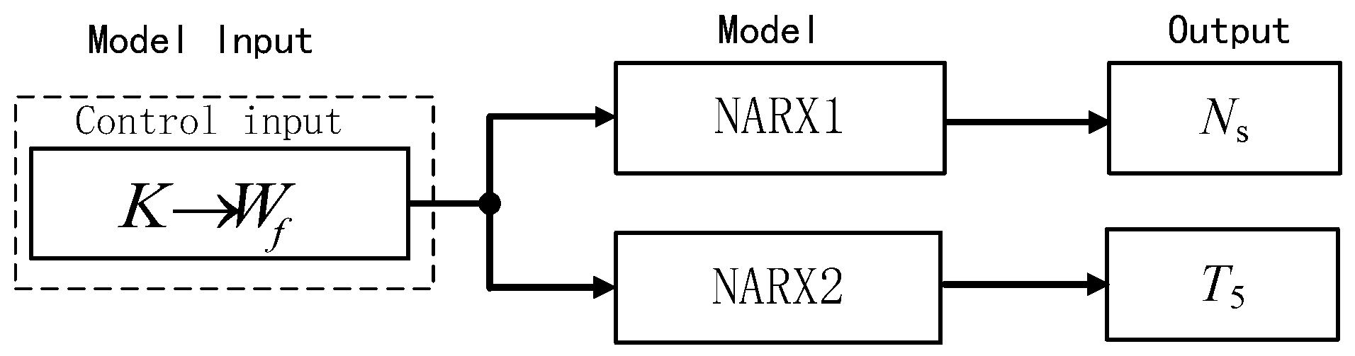 44], and is particularly effective for solving the modeling challenge presented in this paper. Therefore, the NARX model is employed to construct a comprehensive model of the entire operating process of an aero-engine. The evaluation indexes of the model adopt Average Absolute Relative Error (AARE) and Root Mean Squared Relative Error (RMSRE), which are calculated as follows: