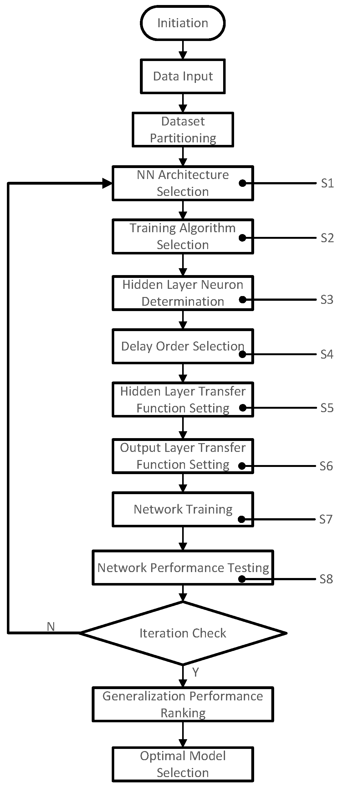 35]. (2) Although the NARX model theoretically has the potential to achieve a high-performance model, the actual performance is often highly sensitive to hyperparameters. Traditional approaches typically involve manual tuning of hyperparameters, such as the number of neurons in the hidden layers, transfer functions, delay orders, training functions, and output layer transfer functions. These methods are inefficient and do not guarantee optimal results, lacking theoretical or experimental guidelines, making it difficult to obtain a convergent NARX model [