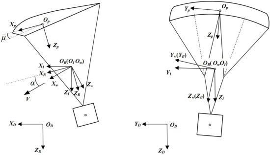 - Zhang, Q.B.; Gao, F.; Guo, R.; Feng, Z.W.; Ge, J.Q. Multibody Dynamics Modeling of Powered Parafoil System Using Equations with Quasi-coordinate. Acta Armamentarii 2019, 40, 1935–1942. (In Chinese) [Google Scholar]