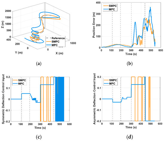 Tracking performance of SMPC and deterministic MPC: (a) three-dimensional flight trajectories; (b) comparison of position-tracking error; (c) symmetrical deflection control; (d) asymmetric deflection control.