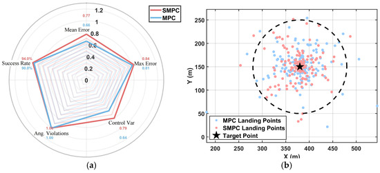 Further, evaluating the comprehensive performance across all 200 simulations, the following five primary indicators are visualized using a radar chart: maximum position error, average position error, change rate of control quantity, violation probability of angular velocity constraint, and tracking success rate (Figure 9a). All indicators are normalized (0 is the worst, and 1 is the best), with the area enclosed by the radar plot serving as a metric for overall performance. The results show that the radar chart area of SMPC is 1.80, significantly higher than that of MPC (1.55), highlighting its comprehensive advantages. Specifically, by accurately predicting disturbances through Markov-based multi-scenario optimization and integrating probabilistic constraint reconstruction with rolling time-domain covariance updates, SMPC achieves cooperative optimization of tracking accuracy, disturbance rejection stability, and energy efficiency. However, MPC is challenging to adapt to the dynamic evolution of the wind field due to its dependence on deterministic assumptions, resulting in conservative control and limited performance. Notably, both controllers achieve high mission-success rates under complex disturbances, which is 94% for SMPC and 90% for MPC, demonstrating the effectiveness of the probabilistic constraint mechanism, as shown in Figure 9b. Nevertheless, significant advantages of SMPC across the comprehensive performance indicators make it more suitable for high-precision airdrop missions.