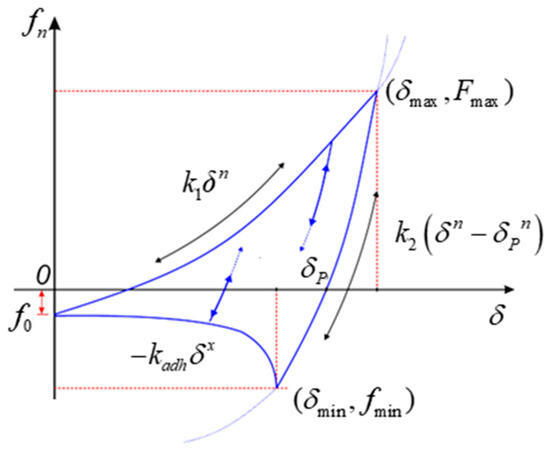 Particle collisions may induce both elastic and plastic deformation, with the latter occurring at sufficiently high impact velocities. Figure 4 illustrates the normal contact force loading path when plastic deformation occurs. During collision, the normal contact force initially increases along the primary loading stiffness curve until reaching maximum overlap. As the particles begin recovery, the contact force follows an unloading stiffness curve due to yielding, eventually reaching zero at a residual overlap defined as the plastic overlap length, δp. In subsequent collisions, the contact force first increases along the previous unloading stiffness curve until reaching the historical maximum force, then transitions back to the primary loading curve. During unloading, when the normal overlap decreases below δp, adhesive forces develop up to a maximum value, fmin, before diminishing with further unloading.