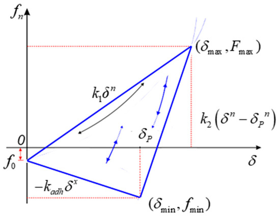 However, the conventional Hertzian contact theory neglects the adhesive effects between particles and considers only their mechanical collisions. Therefore, the viscoelastic contact theory is introduced to incorporate the adhesive interactions between molecules/atoms at particle contact surfaces. This theory correlates the contact area with both the elastic material properties and surface interaction strength, while introducing the concept of particle surface energy. The modified Hertzian contact theory establishes the relationship between relative contact force and approach distance, with the corresponding relationship curve shown in Figure 3.