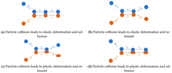 When the relative collision velocity is less than the critical adhesion velocity, the collision velocity is also necessarily less than the yield velocity. The particle collision is thus determined to undergo elastic deformation, as shown in Figure 6a. Based on the aforementioned theory, the particles are deemed to adhere. When the relative collision velocity exceeds the critical adhesion velocity but remains below the yield velocity, the particle collision is still determined to undergo elastic deformation, as shown in Figure 6b. Consequently, the elastic energy generated by the collision is released, causing the particles to separate. When the relative collision velocity exceeds the yield velocity, the particles undergo plastic deformation. Part of the kinetic energy is converted into elastic energy, while another part is dissipated, resulting in irreversible plastic deformation, as shown in Figure 6c. This scenario requires separate discussion.
