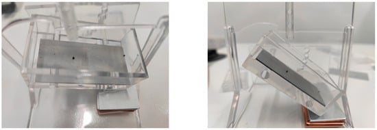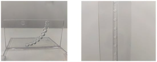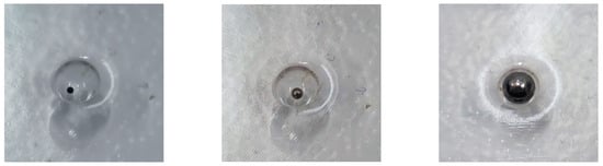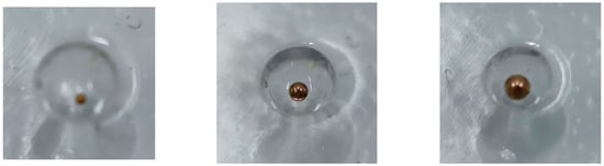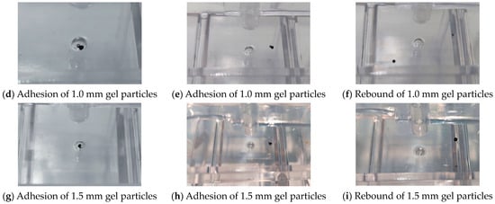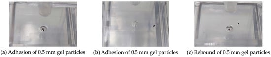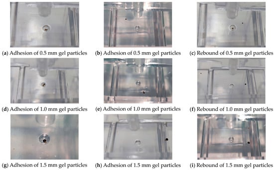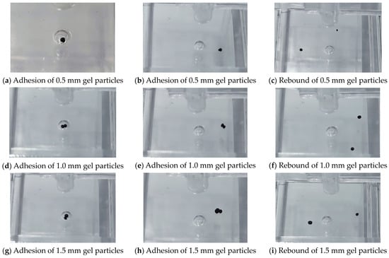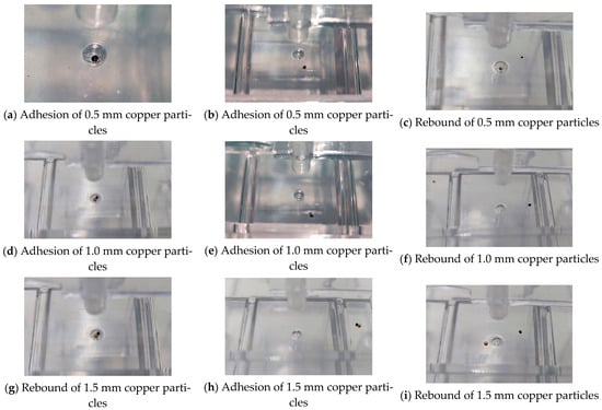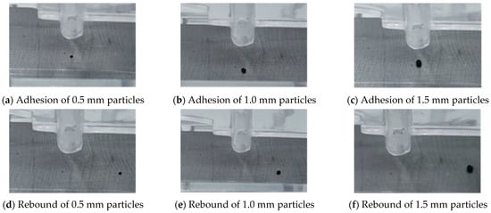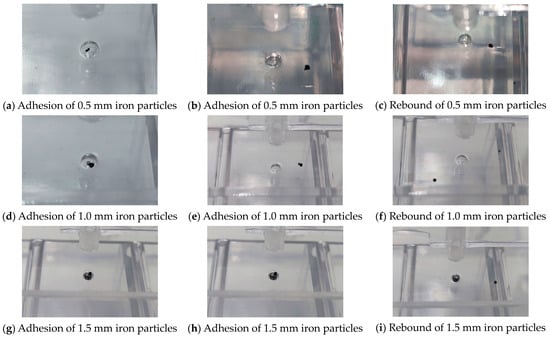 After computing the work performed by the normal contact force, the critical collision velocity between colloidal particles and iron particles of different sizes was determined. Subsequently, the prepared metal particles were placed in the circular holes of the collision chamber, and the colloidal particles were dropped from various heights. The collision results between the colloidal particles and iron particles are illustrated in Figure 28.