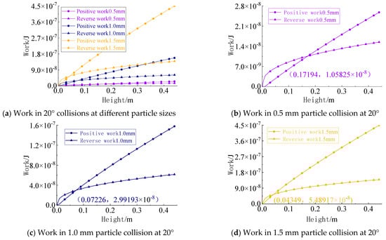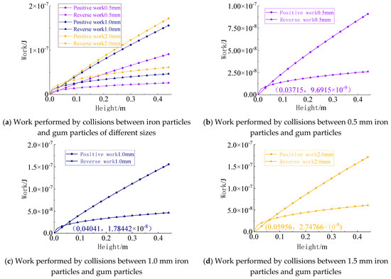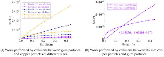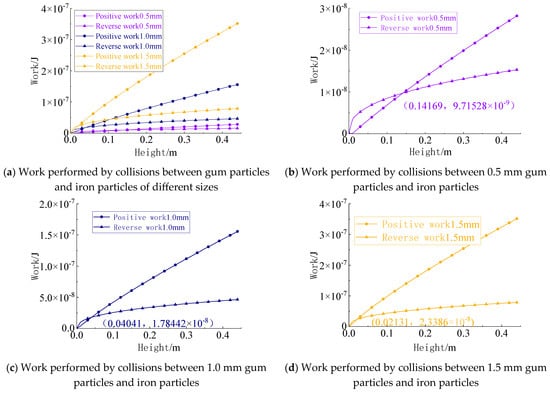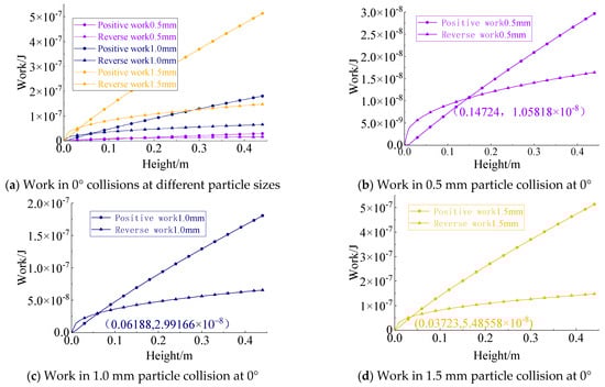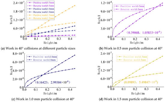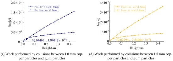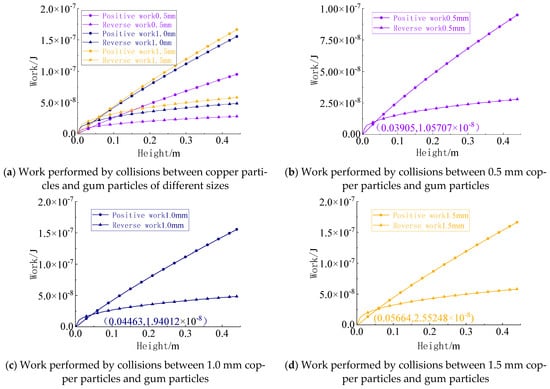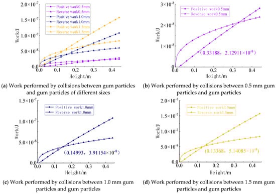The particles used for collision tests were changed to colloidal particles, with their sizes controlled at 0.5 mm, 1.0 mm, and 1.5 mm. The yield velocity and adhesion velocity under these three particle size conditions were calculated to evaluate particle collision deformation. The results show that the yield velocity remained significantly lower than the adhesion velocity. Consequently, the work performed by the normal contact force was calculated, yielding the computational results presented in Figure 31.