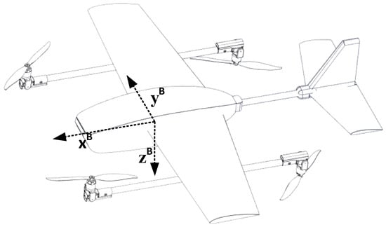 The total forces acting on the aircraft consist of aerodynamic force (), gravity (), and propeller thrust force (). The total force acting on the UAV in the body frame is expressed in Equation (3):