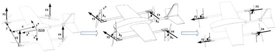 The motor force and position vectors are shown in Figure 3. In the transition mode, the motor’s rotation angle is denoted as λ. By varying the rotation angle (λ) between 0 and 90 degrees, the vehicle transitions between rotary wing mode and fixed wing mode. The position and rotation vectors of the motors are expressed in Equations (11) and (12), respectively.