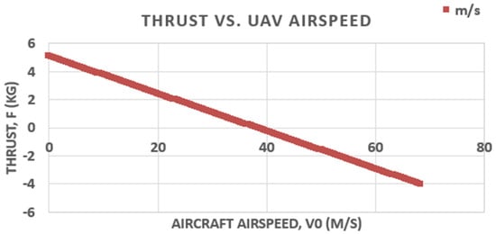 where F (N) is the propeller thrust, d (in.) is the propeller diameter, RPM is the rotational speed, pitch (in.) is the propeller pitch, and V0 (m/s) is the forward flight velocity. The thrust–velocity characteristics of the selected motor–propeller combination are shown in Figure 4.