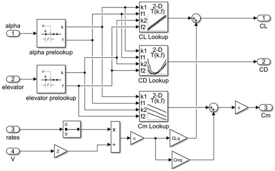 Implementation of Longitudinal Force and Moment Coefficients Using Prelookup Tables in Simulink.