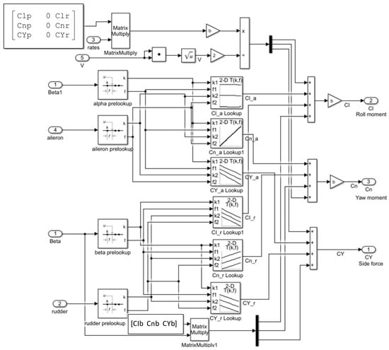 In Equations (19)–(21), the contributions of aileron and rudder deflections to roll moment, yaw moment, and side force are modeled using aerodynamic data similar obtained from XFLR5. These data are also transferred into prelookup tables within the Simulink environment. As a result, variations in aileron and rudder deflections lead to realistic calculations of lateral forces and moments, enabling the simulation of the UAV’s lateral dynamic responses. Figure 6 illustrates the integration of lateral force and moment coefficients into the Simulink model.