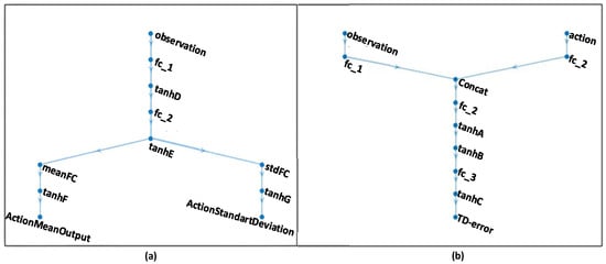 A key feature of SAC is entropy regulation. The policy is trained to maximize the balance between the expected payoff and entropy, which measures the randomness in the policy. This is closely related to the exploration-exploitation tradeoff. Increasing entropy promotes more exploration, thereby accelerating learning. It also helps prevent the policy from prematurely converging to a poor local optimum. The agent used in training consists of two neural networks: the critic and the actor. The structure of the actor and critic networks is depicted in Figure 7. These networks serve as function estimators [31]. The structure of the neural networks in our study is specified as follows: the critic takes the state and action as inputs and outputs a value function that estimates future rewards. The term Time Division Error (TD-error) usually refers to time slot overlaps or timing errors in time division multiplexing systems. The actor network takes the state observed by the agent as input; this state represents information from the environment. The output includes the average action value and the standard deviation of the action.